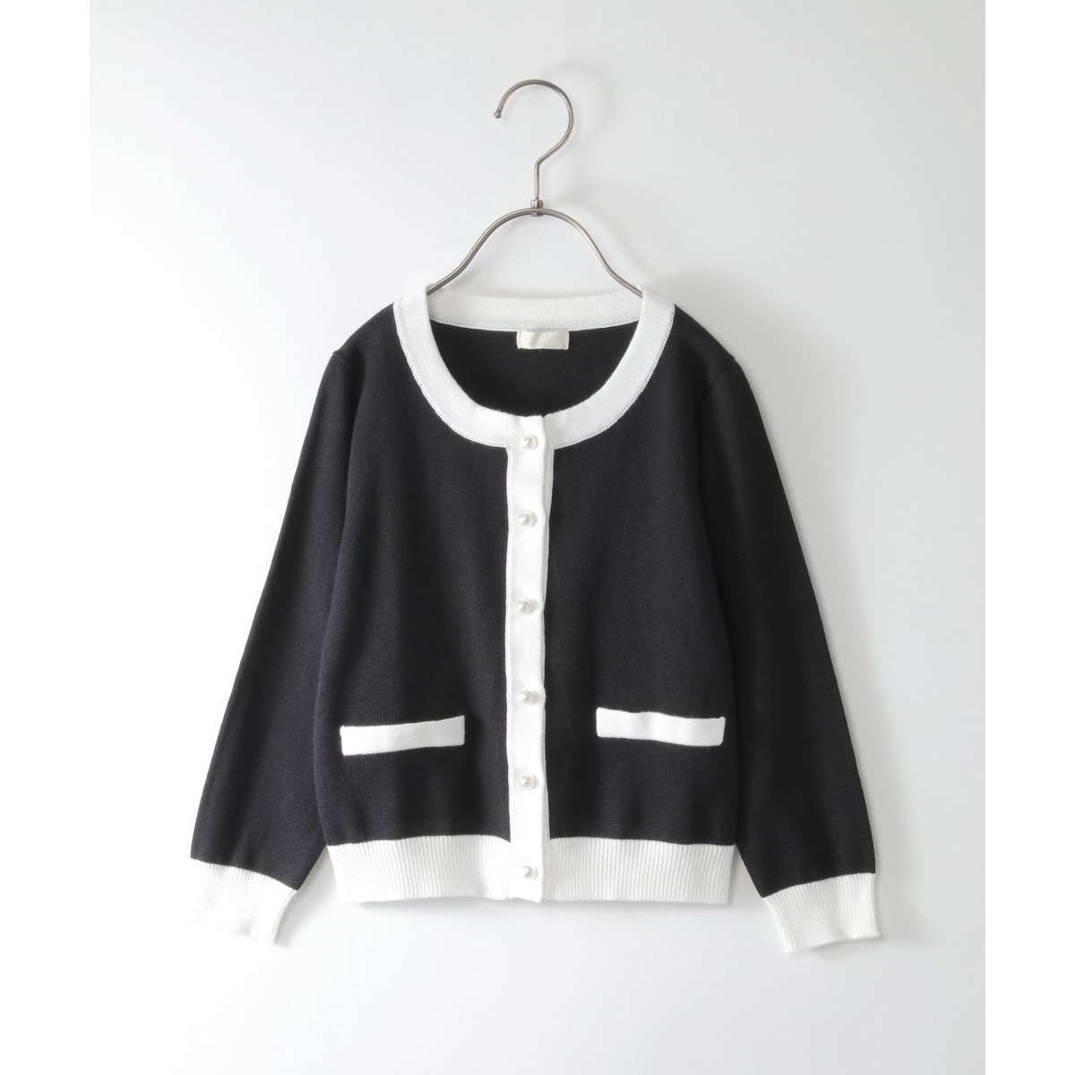 パールボタンがアクセントになった、可愛らしいニットカーディガン。