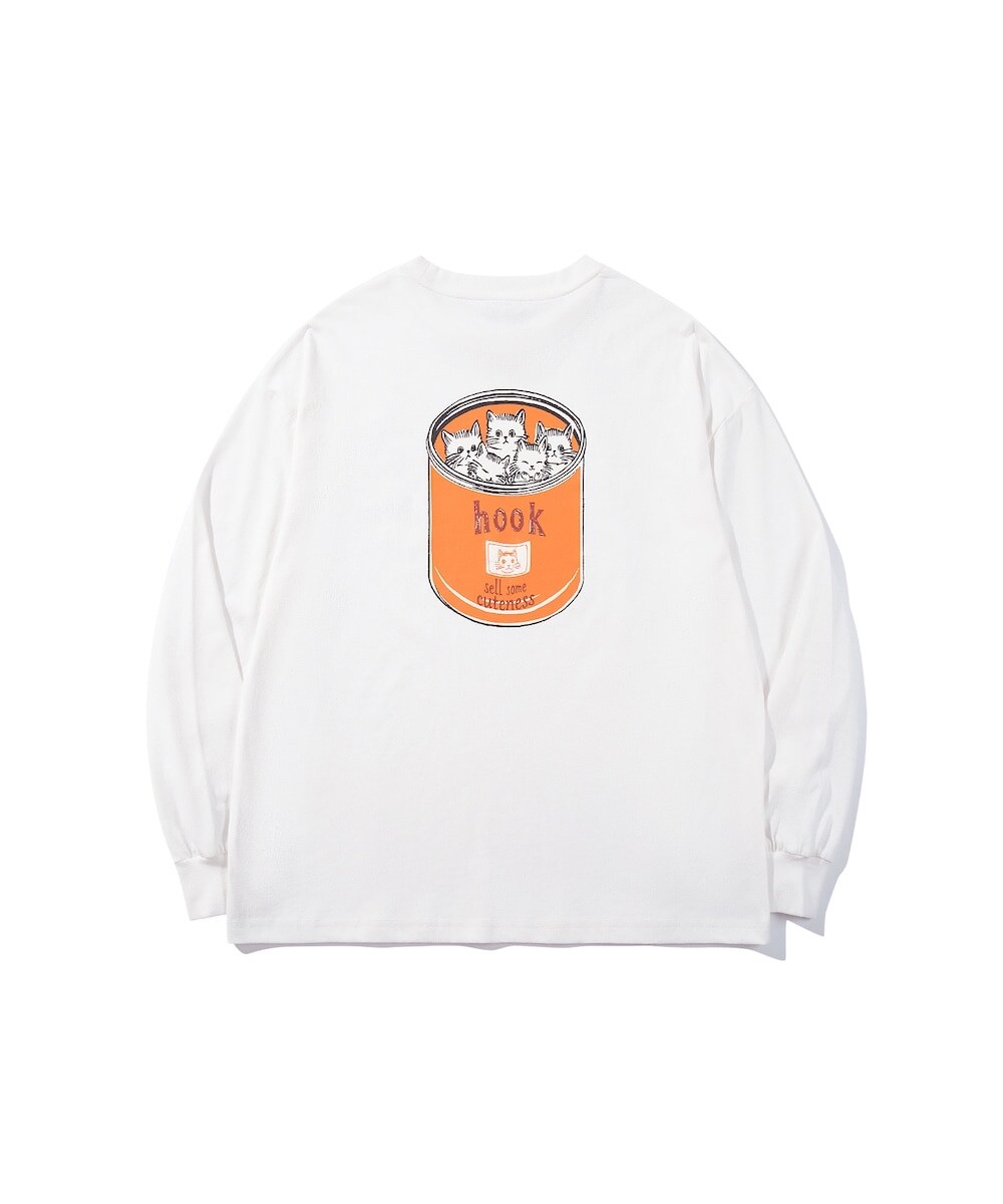 フロントにはシンプルなワンポイントロゴ、バックにはヴィンテージ風の猫を缶に詰め込んだイラストを大胆にプリント。ユーモラスなグラフィックが、カジュアルなスタイリングに個性的なアクセントをプラスします。