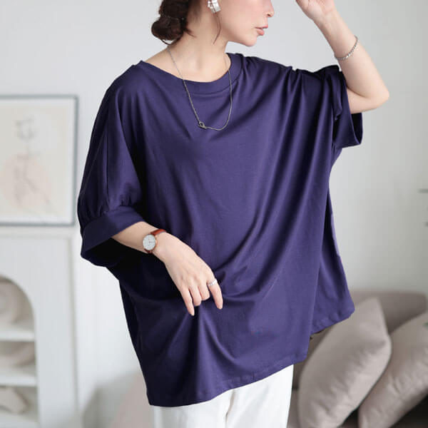 ラフに着こなして華奢見えする、接触冷感&UVカットコットンドルマンカットソーの登場です☆ぽっちゃりさんに大人気のドルマンシルエット!ゆったりラフに着こなせるゆとりのある身幅に、ヒップラインがしっかり隠れる長め着丈で、気になる部分丸ごとすっぽりカバー◎広めの袖口幅から手首を覗かせることで華奢見せ効果も♪毛玉になりにくいひんやりタッチの接触冷感生地にUVカット機能をプラス☆綿100%生地で、吸湿性・通気性に優れしっかり汗を吸い取るので暑い季節も快適にご着用いただけます◎