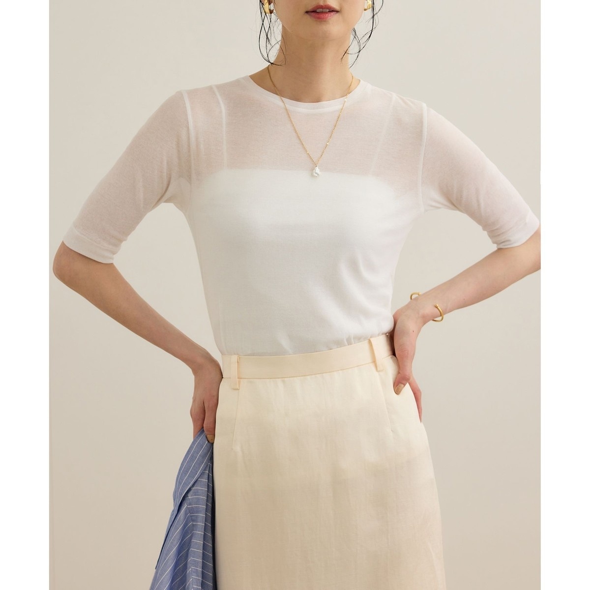 5分袖でさりげなく二の腕をカバーしつつ、タイト過ぎないシルエットで程よいフィット感なので、リラックス感のある着心地です。