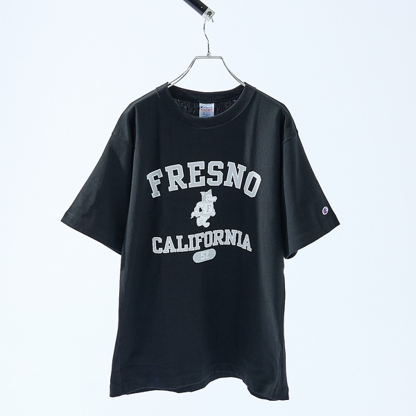 胸のプリントはチャンピオンブランドと親和性の高いカレッジ風グラフィックを現代に落とし込んだもので、アーチ状とストレート状の文字組にマスコットを組み合わせたデザイン。