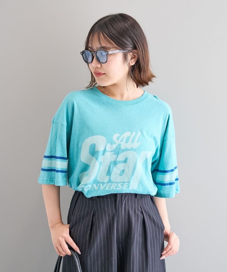 フロントのグラフィックロゴと袖のラインがポイントのCONVERSEフットボールTシャツ。