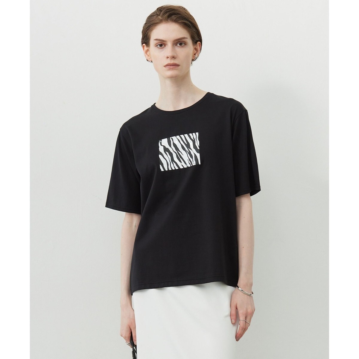 ■デザインアニマルプリントの上にスパンコールをたたきつけた立体感あるモチーフがポイントのきれい目Tシャツです。プリントはモノクロでシャープな印象ながら、透明のスパンコールでゼブラ柄の見え方に奥行きを持たせクラフト感のある仕上がりになっています。