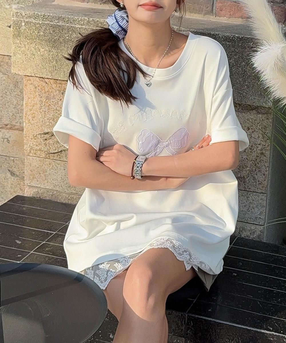 リボンモチーフのプリントに繊細な立体感をプラスした、大人可愛い印象のゆったりTシャツ。華奢な曲線で描かれたモチーフが、甘さを控えつつ女性らしさを引き立ててくれます。