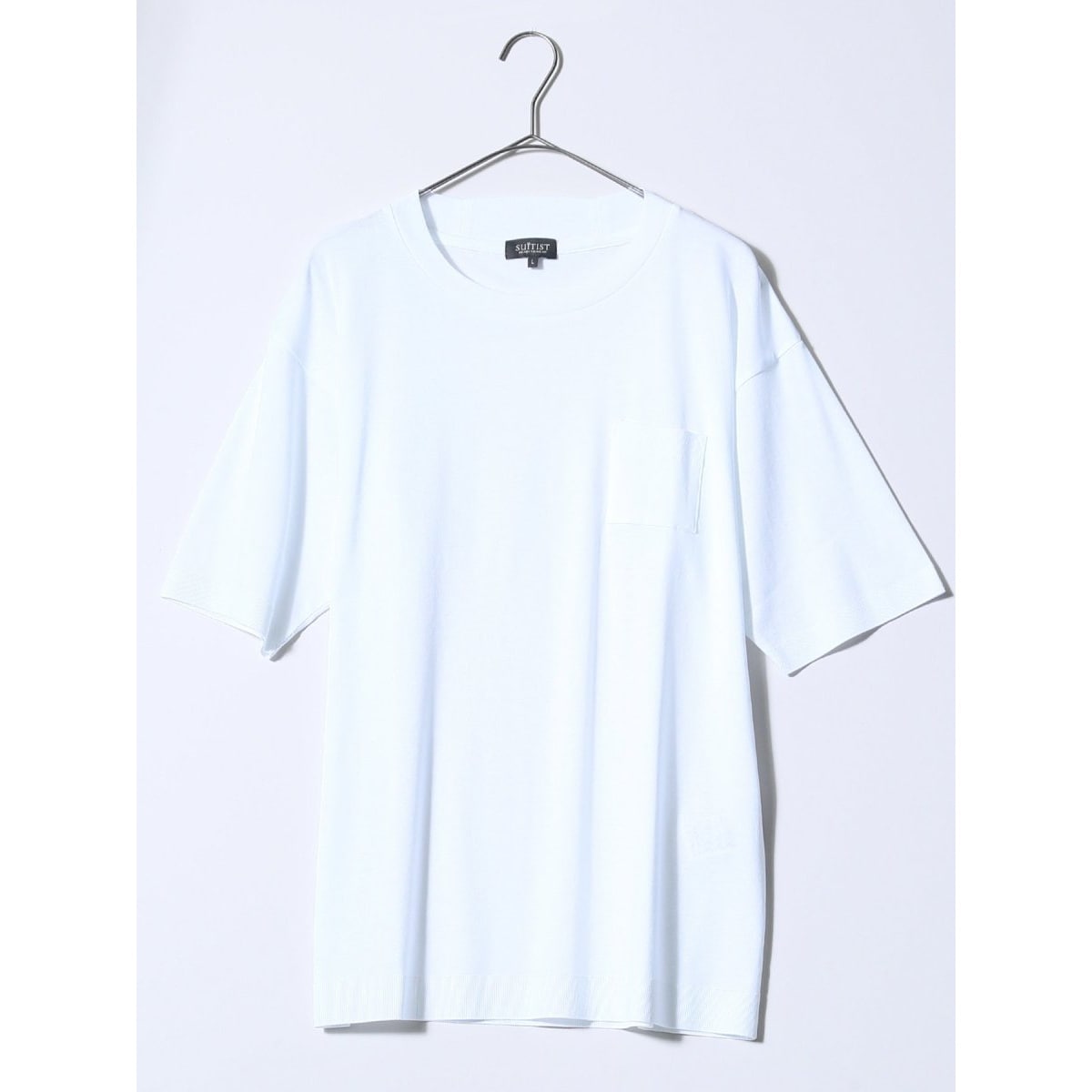 ベーシックなクルーネックの半袖Tシャツです。リブ部分からスタートして身頃を編んでいくリブスタートと呼ばれる手法を採用しています。左胸のポケットがアクセントになっています。
