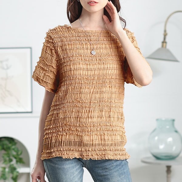 シフォン生地にたっぷりギャザーを寄せたシャーリング生地が立体感をつくり、一枚で着映えるカットソーは、シンプルながらも女性らしい存在感を発揮します。透け感のあるシフォン素材が季節感をプラスし、コーデを盛り上げてくれる一枚。たっぷりギャザーで伸縮性も良く、コンパクトな見た目ながらも窮屈感のない着心地。さり気ないフリル感とシャーリング生地の立体感で体型を上手に隠してくれます。タックインでもアウトでもサマ見えする、すっきりとした丈感でボトムスを選びません。