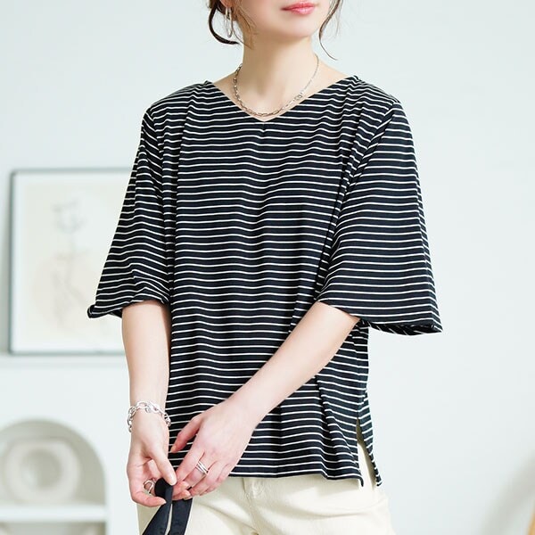 カジュアルスタイルの王道であるボーダー柄の生地で仕立て上げたアクティブ感ある一枚。廃りの無いトレンド柄がコーデにリズムを加えながら、フレアスリーブが女性らしいひと匙に。ベーシックな色展開だからボトムスを選ばず、使い勝手の良いカットソーです。愛らしさを演出するフレアスリーブが二の腕をしっかりカバーし、前後Vネックでお顔周りをすっきりさせ、ゆったり身幅でストレスフリーな着心地。裾サイドにスリット入りでインもアウトもサマ見え。接触冷感機能に抗菌防臭機能付きだから、汗ばむ季節にもひんやりとした肌心地に、気になるニオイも防ぎます。