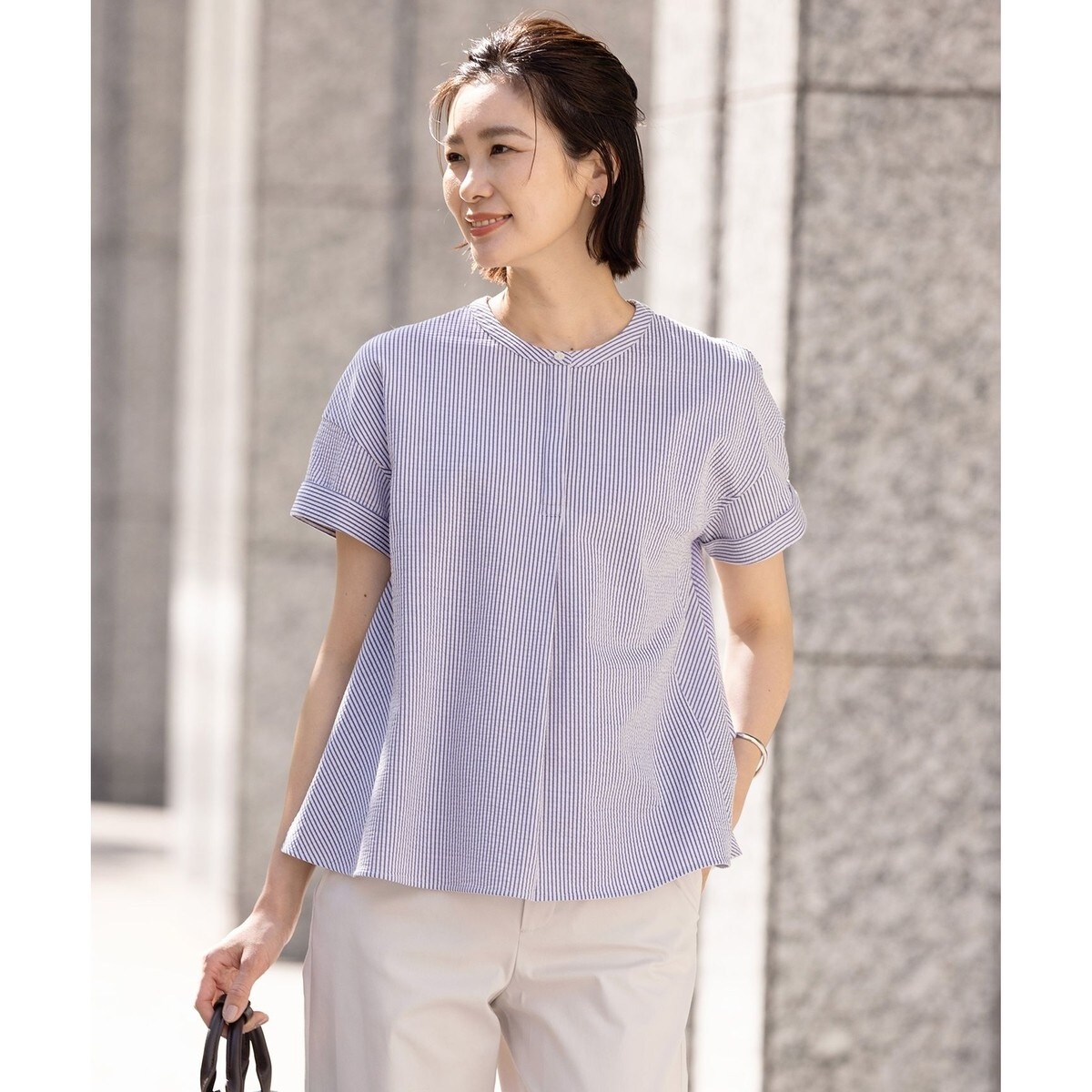 ■デザイン前立てが比翼仕立てになった、ブラウス風の長めフレンチスリーブカットソー。柔らかなAラインフレアが美しく、袖口から裾へ流れるパネルラインがバイヤス技法で洗練された表情を醸し出し、デザインに深みを与えています。丈感はワイドパンツや細身パンツにも合わせやすく、幅広い着こなしを楽しめます。二の腕が隠れる袖丈なのもうれしいポイント。涼しげなストライプ柄が夏スタイルのアクセントとなり、全体のコーディネートを一気に格上げするアイテムです。