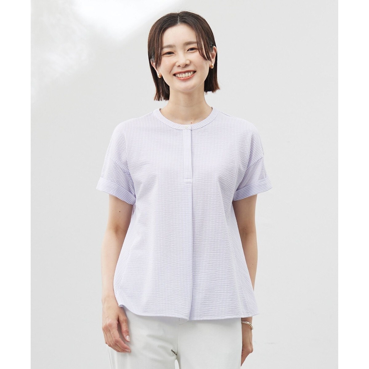 ■デザイン前立てが比翼仕立てになった、ブラウス風の長めフレンチスリーブカットソー。柔らかなAラインフレアが美しく、袖口から裾へ流れるパネルラインがバイヤス技法で洗練された表情を醸し出し、デザインに深みを与えています。丈感はワイドパンツや細身パンツにも合わせやすく、幅広い着こなしを楽しめます。二の腕が隠れる袖丈なのもうれしいポイント。涼しげなストライプ柄が夏スタイルのアクセントとなり、全体のコーディネートを一気に格上げするアイテムです。