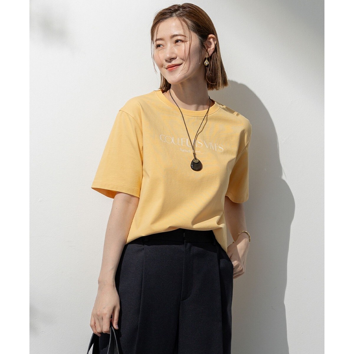 ロゴをあしらったベーシックなシルエットのカラーTシャツ。ロゴは「COULEURS VIVES 鮮やかな彩り」と綴り、夏に向かってワクワクする気分を、彩り鮮やかにファッションを楽しむことで表現してほしいと思いを込めています。廃棄された植物から抽出された染料を使用し生地染めをしている環境に優しいボタニカルなTシャツです。カラーは、ベーシックなホワイト(#001)、ヴィヴィッドな発色が目を引くフューシャピンク(#011)、大人っぽいダークブラウン(#035)、ヘルシーな印象のイエロー(#040)、ニュアンス感のあるダルブルー(#074)、フェミニンな雰囲気のライラック(#082)の6色展開です。
