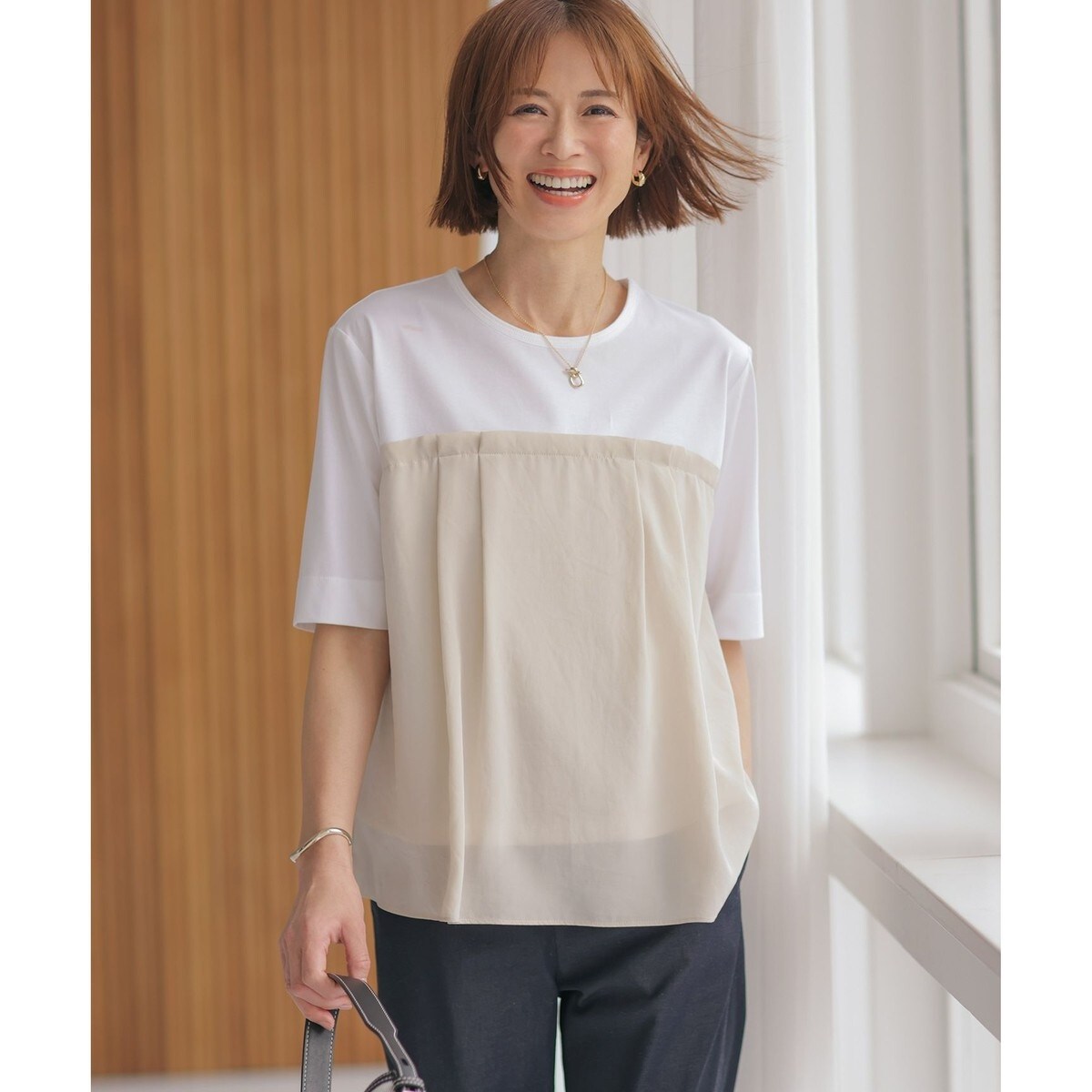 ■デザイン身頃上と袖をジャージ、身頃下を布帛ドッキングした、ビスチェライクのプルオーバー。タックをとって、ゆれるシルエットにし、ほどよいフレアをだしました。オンにもオフタイムにも着用できるトレンド感があり、さっと1枚着るだけでスタイリングが決まる万能アイテムです。