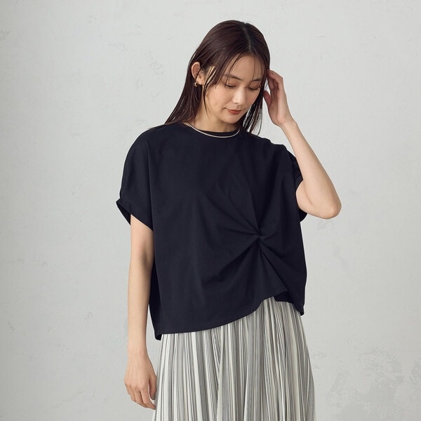 肩先が隠れるアームホールのないスリーブでスッキリとカジュアルに着こなせます。