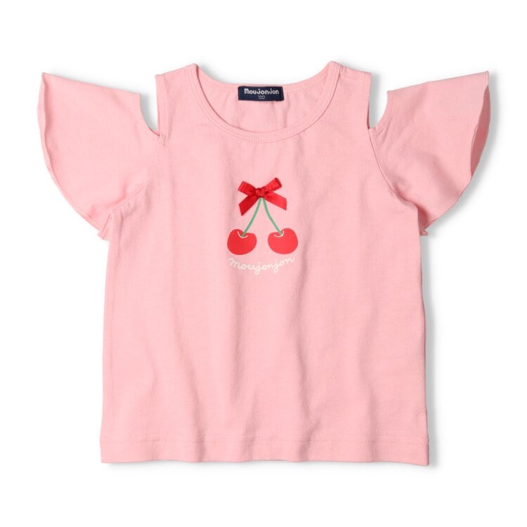 リボンのモチーフが付いたフルーツのプリント入りのTシャツ。ピンクはサクランボ、サックスはパイナップル。肩開きデザインがこどもも大好きなデザイン。【アイテム】トップス シンプル ガーリー フェミニン カジュアル お洒落 オシャレ かわいい 可愛い 普段着 デイリーウェア お出かけ着 お外着 お外遊び着 子ども こども 女児 女の子 ガールズ キッズ ベビーサイズ トドラーサイズ 幼稚園 保育園 小学校 通園 通学 小学生 2025年春夏物新作 丸高衣料 水色 さくらんぼ チェリー パイン ムージョンジョン りぼん コットン100% 綿100%