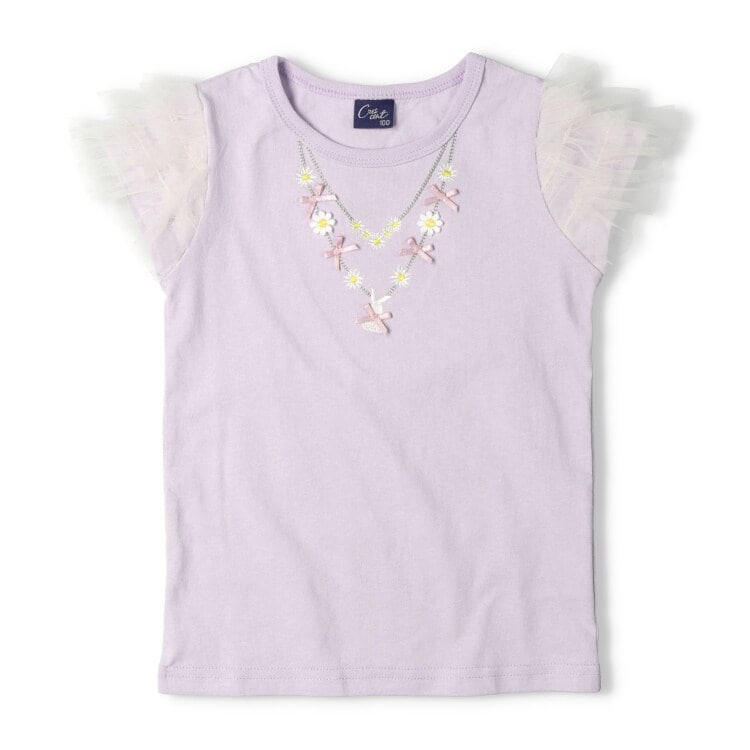 オフホワイトは小花柄のうさぎのアップリケ、ラベンダーはリボンやお花のネックレス風の刺繍。袖はチュール素材で女の子らしい!パンツともスカートとも合わせやすい半袖Tシャツ。【アイテム】トップス シンプル ガーリー フェミニン カジュアル お洒落 オシャレ かわいい 可愛い 普段着 デイリーウェア お出かけ着 お外着 お外遊び着 子ども こども 女児 女の子 ガールズ キッズ ベビーサイズ トドラーサイズ 幼稚園 保育園 小学校 通園 通学 小学生 2025年春夏物新作 丸高衣料 白色 薄紫色 クレセント ウサギ フラワー お花 りぼん