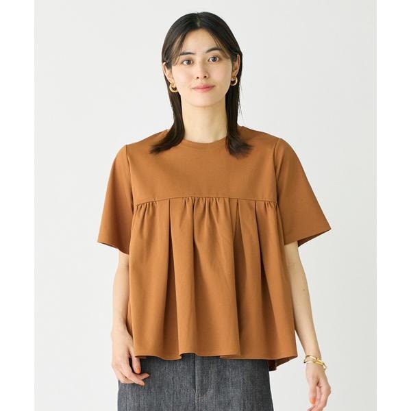 素材のハリを活かした立体的なランダムに入れたタックギャザーがポイントのデザインカットソー。詰まったネックラインで甘すぎないモードな雰囲気に仕上げました。程よい袖丈が、気になる二の腕をカバーしながらもすっきりとしたバランスで着用していただけます。スタイリングのポイントになる存在感のあるデザイントップスです。・水洗い可■素材■表面の光沢とハリ感が特徴のポンチ素材。毛羽を極限まで抑えたコンパクト糸を使用し、さらに表面を滑らかにする加工(マーセライズ加工)を施す事でシルキーな光沢のある表面し仕上げています。上質な綿とポリエステルを高密度で編む事で、適度なハリがあり、ボディラインを拾わない肌離れの良いストレスフリーな素材感もポイントです。洗濯後の型崩れなどが生じにくい、イージーケア性も併せ持った素材です。