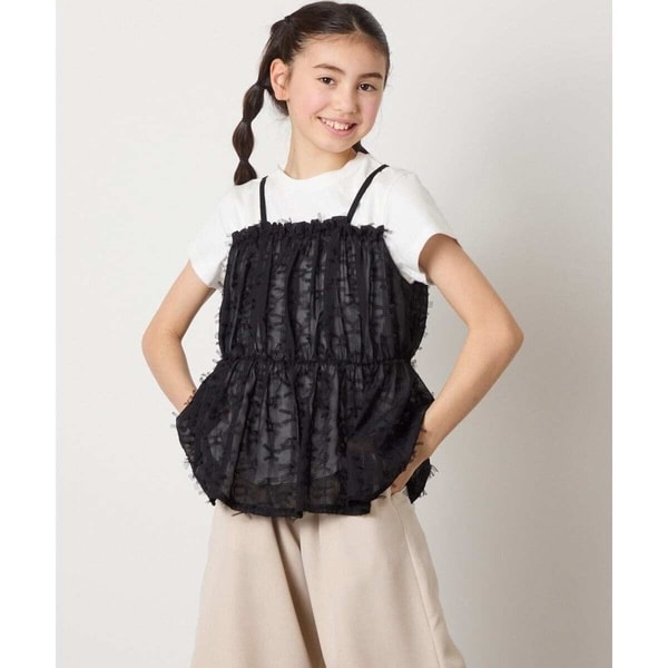 ・シンプルTシャツに、今季トレンドのフェザーチュールシフォン素材を使用したキャミをドッキング。