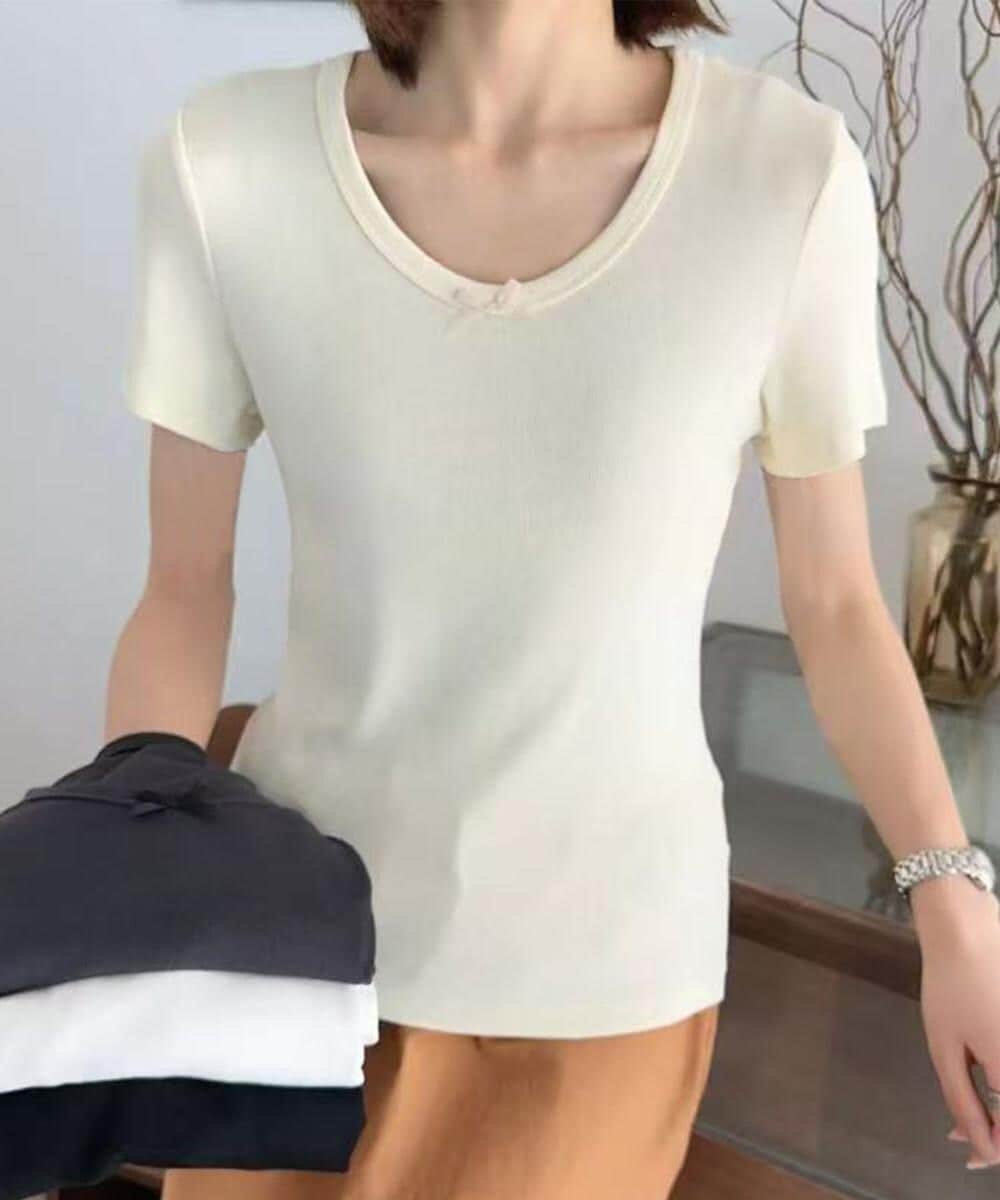 シンプルなデザインで、胸元に小さなリボンが施されたTシャツです。柔らかい素材感が肌に優しく、適度にフィットするデザインでスタイルアップ。シンプルながらも細部にこだわりが感じられ、デイリー使いに最適なアイテムです。