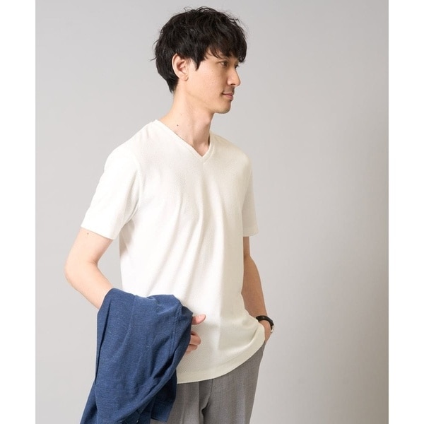 リンクスジャカード素材で上品見えするキカ柄を表現したVネックカットソー。