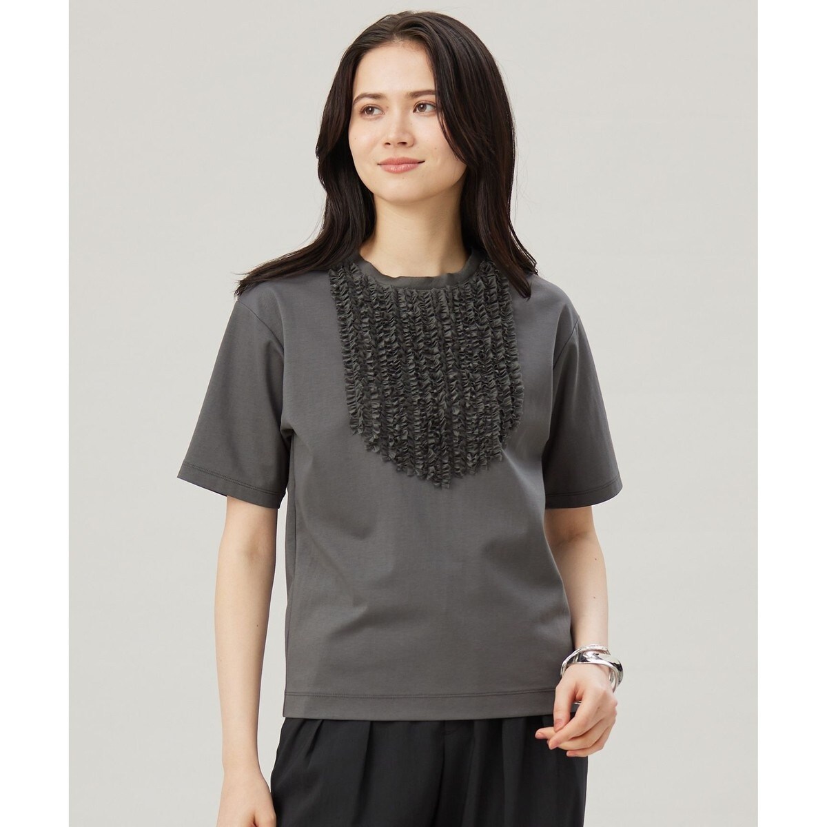 フロントのフリルディティールがフェミニンなTシャツ■デザイン薄地の生地を切りっぱなしにしギャザーを寄せた、胸元のフリルディティールが特徴の華やかなTシャツです。ブラウスライクで上品に仕上がっています。キレイ見えしながらベースはジャージなので、快適な着心地なのも嬉しいポイントです。■素材ストレッチ性に優れ、シワになりにくく、反発性とドレープ性がある素材です。上質な綿特有の繊細な光沢が特徴で、接触冷感、UVカット、速乾性の機能が付いているので、暑い時期にも着て頂きやすい素材です。特殊加工により肌離れがよく、乾きやすいように仕上げております。フロントのフリルは、薄地でありながら肌触りが滑らかで上品な風合いが特徴の素材です。