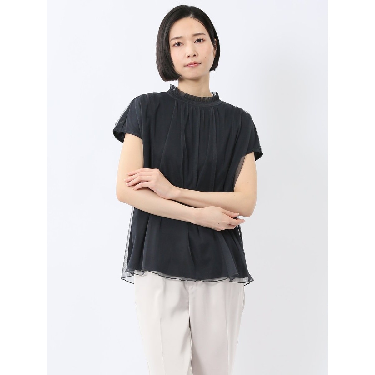 クラシカルな雰囲気に仕上げたギャザーネックの半袖プルオーバーです。シアー感のあるチュール素材を重ねた涼しげなルックスも魅力的です。