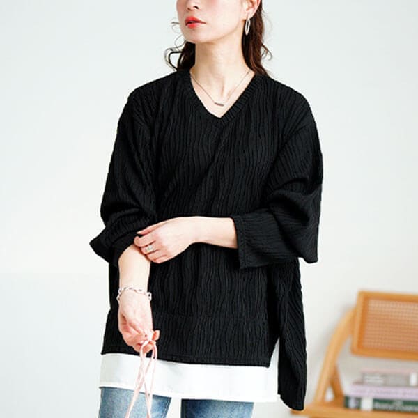 サッと一枚着るだけで手抜きに見えない!ウェーブプリーツフェイクレイヤードプルオーバーの登場です☆目を惹くウェーブ柄で縦ラインを強調しスタイルアップ効果抜群!体型を拾わないゆったり身幅&袖幅でリラクシーなサイズ感で着用していただけます◎裾からカットソーを覗かせているかのような重ね着風のデザインで、お気に入りのボトムスに合わせるだけでこなれ感のある褒められコーデが完成します◎お尻がすっぽり隠れる長めの着丈で気になるヒップラインをカバーしてくれるのもオススメのポイントです!