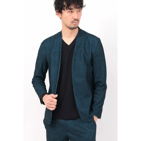 マーブル調プリントの4WAYトリコット素材を使用したノーカラージャケットです。