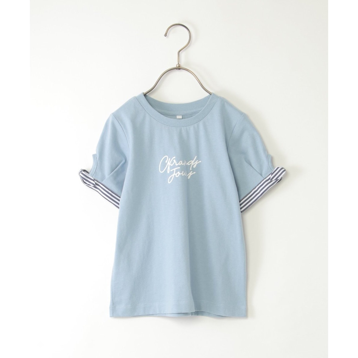 シンプルなロゴTに、袖口のストライプ柄リボンで可愛らしさをプラスした一枚。