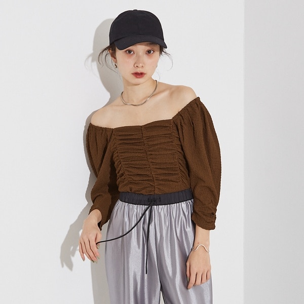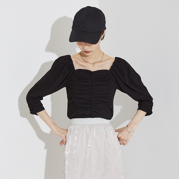 フィットしたシルエットにに入ったギャザーデザインと袖のボリュームがポイント。