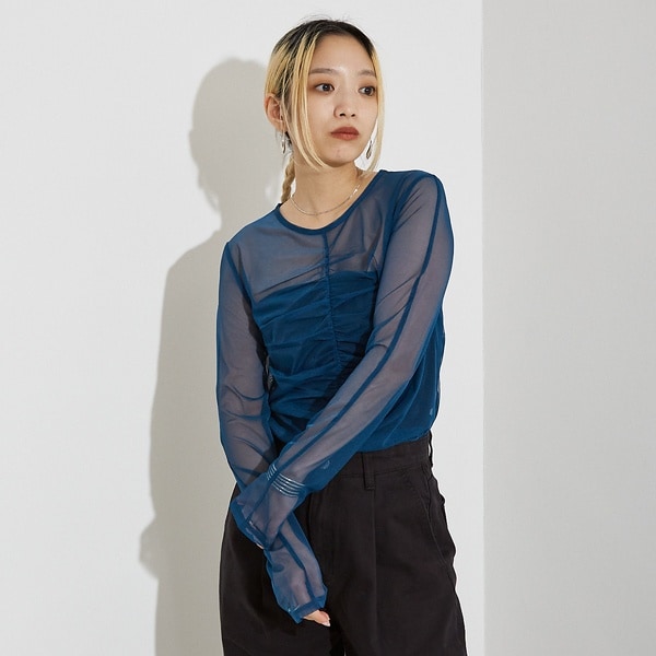 フロントに施されたシャーリングがアクセントのメッシュロンT。