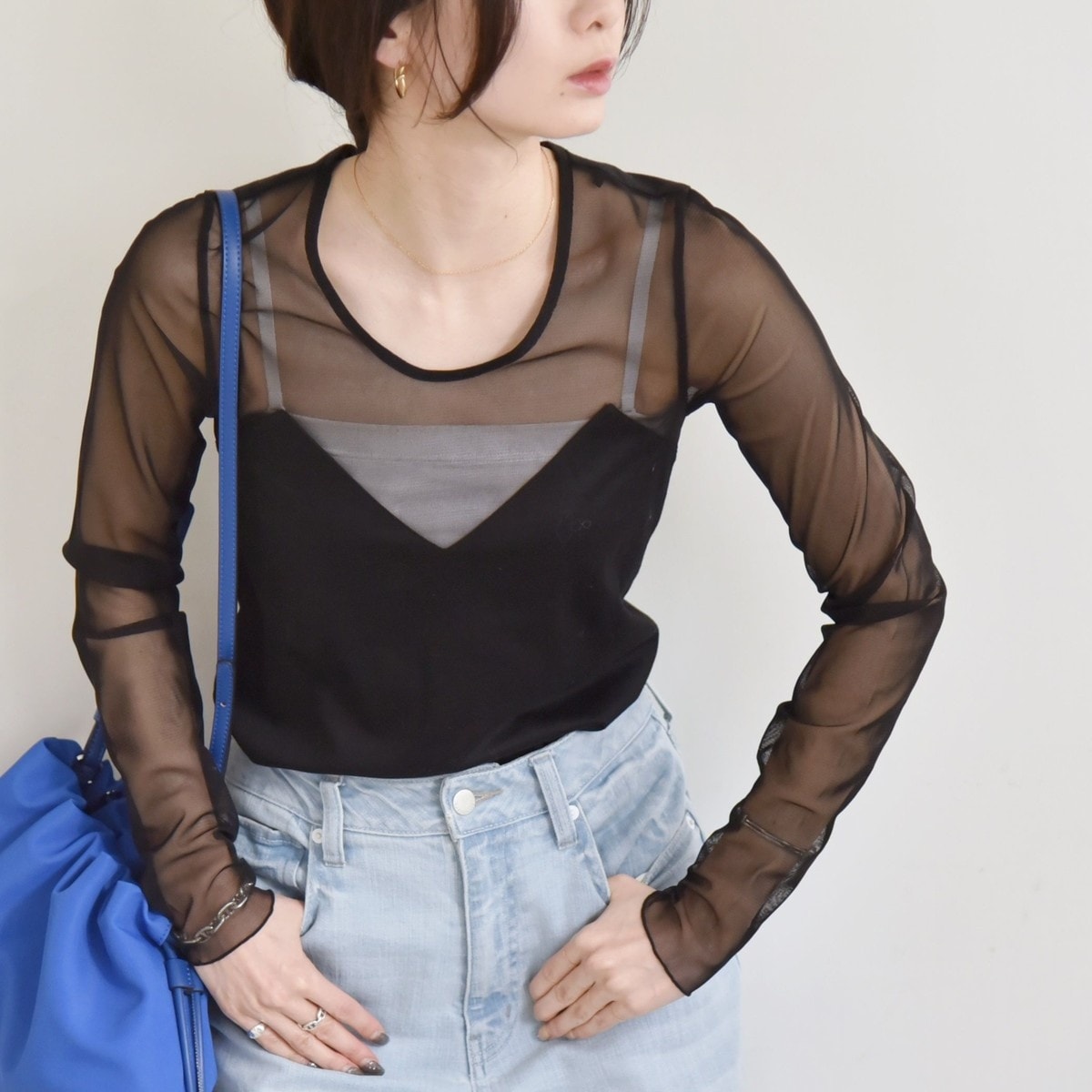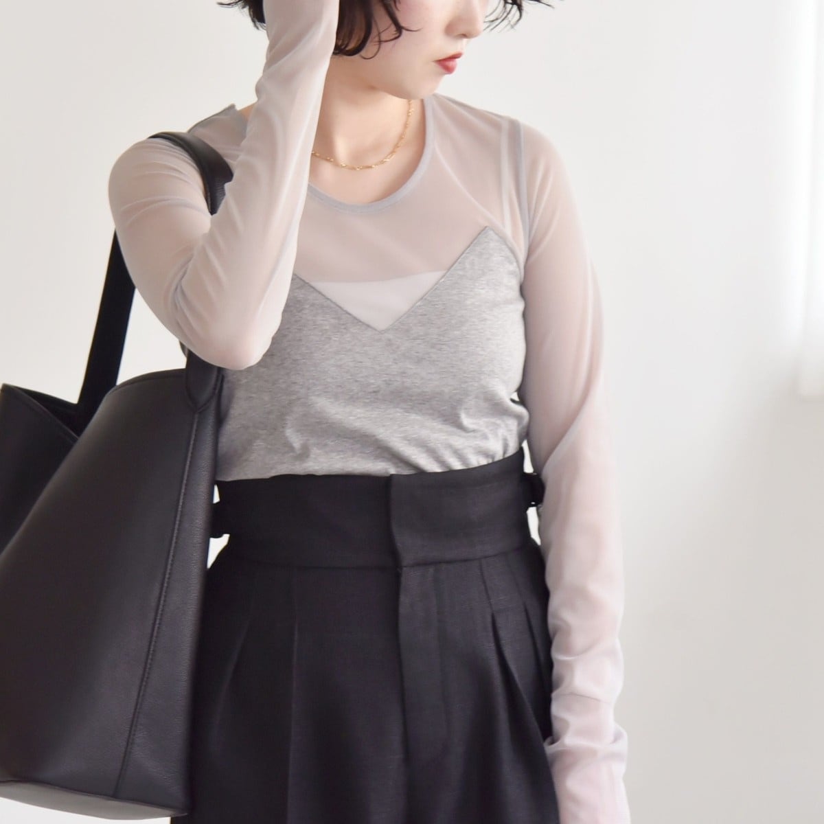 スウェットやニットなどとレイヤードしてシアー感のある袖だけちらっと見せても◎