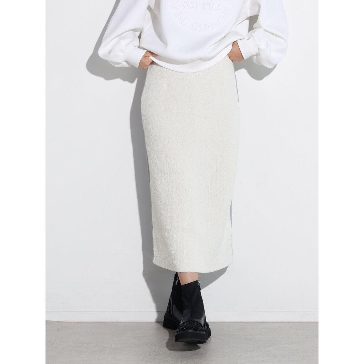 前後身頃を異素材で切り替えたナロースカート。