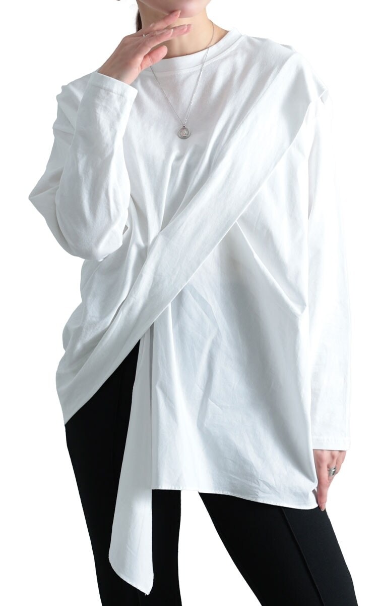 斜めに切り替えられた異素材ドッキングに、ひらひらと流れるヘムラインが印象的な一枚。クルーネックの首元で柔らかな印象を纏い、カジュアルライクな雰囲気に。大胆に斜めに切り替えられたカットソーとブラウス生地の異素材使いが今っぽさを演出します。ゆらりと揺れる裾のデザインがレディ感を演出し、華やかさをプラス。シルエットに動きを加え、スリムな袖が全体のメリハリをプラス。大人世代が着こなしやすい色展開で、シンプルながらもコーデに取り入れるだけで着映え力抜群な逸品。スタイリッシュな個性を醸し出すリュクスなトップスです。
