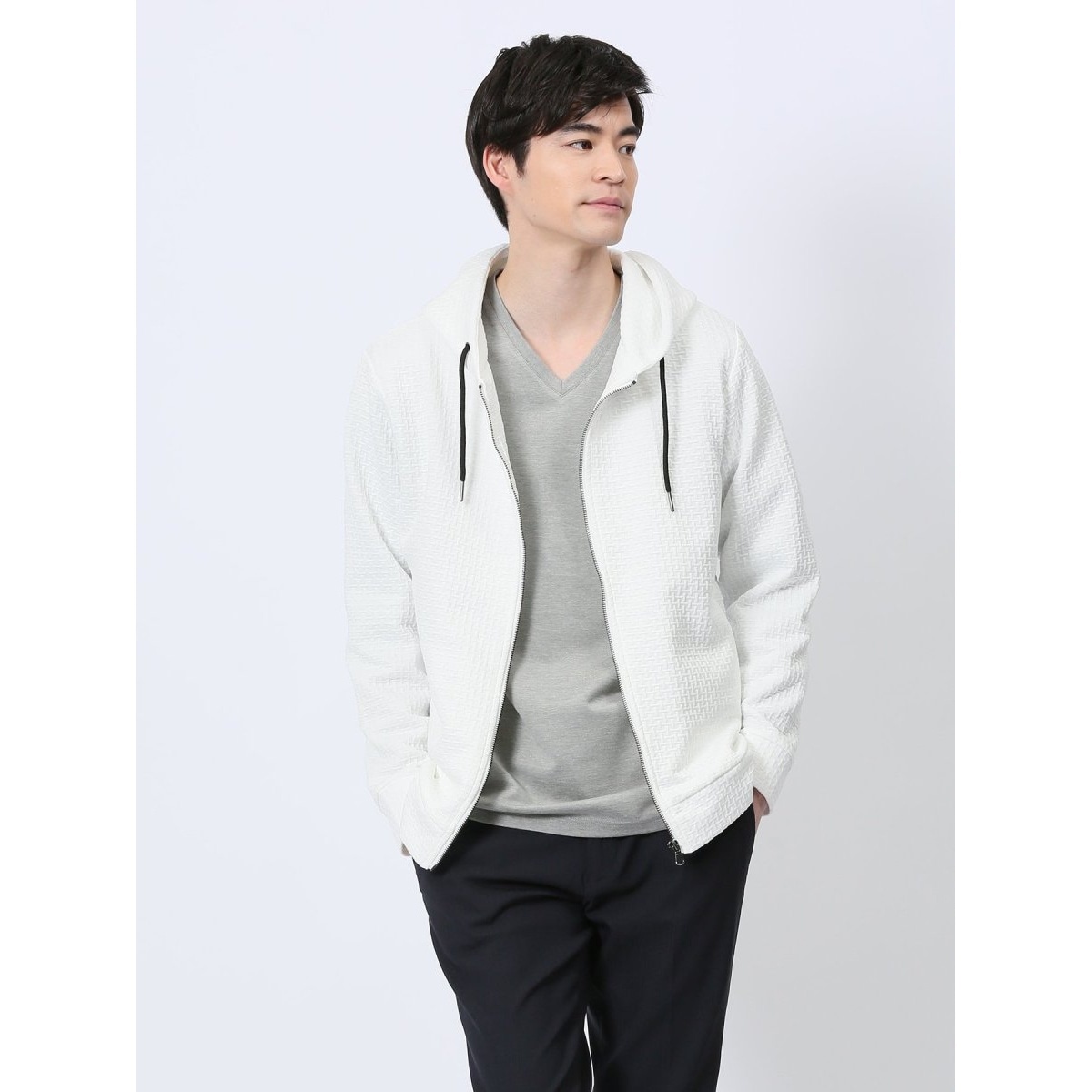 サラッと羽織れるフルZIPの長袖パーカーです。凹凸感のあるジャガード柄で高見えするルックスに仕上げています。すっきりとしたシームポケット付きで利便性にも優れています。