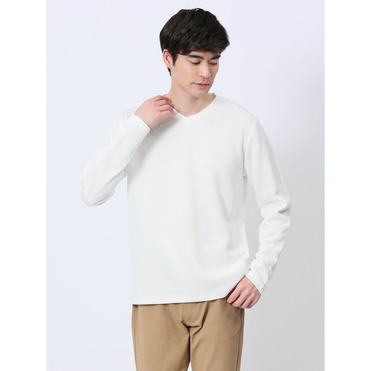 ダブルフェイスのニットソーで、シンプル過ぎない存在感のあるVネックの長袖Tシャツです。一枚で着るのはもちろん、ジャケットやシャツ、ベストのインナーとしても便利なアイテムです。