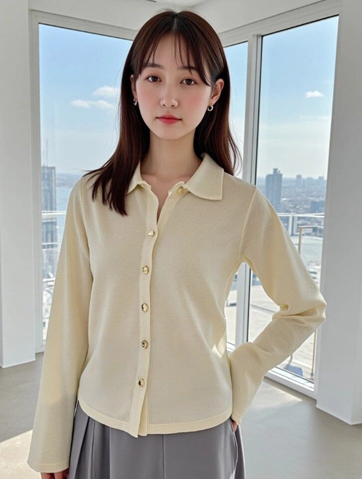 キラキラとしたラメ感が華やかな雰囲気の襟付きプルオーバー。一枚着としてはもちろん、フロントのボタンを開けて羽織りとしての着こなしも楽しめます。様々なボトムスと合わせやすく、カジュアルからきれいめまで幅広いスタイリングに活躍するアイテムです。
