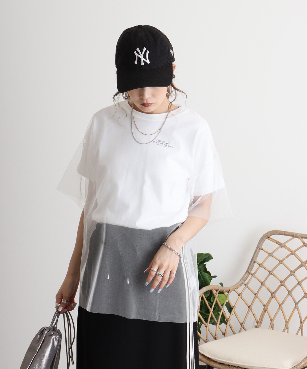 ロゴT&チュールTコンパクトアンサンブル◇POINTシンプルなロゴTシャツとフェミニンなチュールTシャツを組み合わせたコンパクトアンサンブルです。ロゴTはカジュアルな雰囲気を演出し、チュールTは華やかさをプラスします。異素材ミックスが絶妙なバランスを作り出し、さまざまなシーンで活躍するアイテムです。◇FABRICチュールは、シャリ感があり透け感のある素材です。◇COORDINATEセットでの着用はもちろん、単品使いもできて着回し力抜群!チュールトップスは、お手持ちのカットソーと合わせたり、ワンピースやタンクトップなどとのレイヤードスタイルも◎ボトムは、定番のデニムパンツ(ジーンズ)やワイドパンツと合わせた大人カジュアルスタイルや、マーメイドスカートやタイトスカートなどと合わせたフェミニンな着こなしもおすすめです。サマーキャップやキャスケット、ミニウォレットやスマホショルダーなどの小物を合わせれば遊び心のあるコーデに♪【サイズ】
