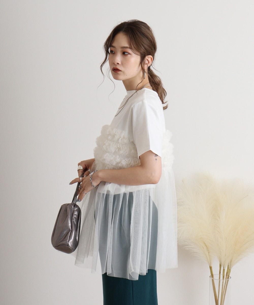 プリーツチュールドッキングTシャツ◇POINT軽やかなチュール素材と繊細なプリーツ加工を施したドッキングTシャツです。エレガントなチュールがボディラインに柔らかくフィットし、動きに合わせて揺れるプリーツが女性らしさを引き立てます。カジュアルなTシャツデザインとフェミニンなチュールの組み合わせが絶妙なバランスを生み出し、日常のコーディネートに特別感をプラスします。シンプルながらもディテールにこだわった一枚で、デニムやスカートと合わせて幅広いスタイルを楽しめます。◇FABRICチュールは、シャリ感があり透け感のある素材です。◇COORDINATE夏に1枚での着用はもちろん、カーディガンやノーカラーシャツのインナーとして◎デニムパンツ(ジーンズ)やワイドパンツと合わせた大人カジュアルな着こなしも◎トレンドのマーメイドスカートやタイトスカートなどと合わせたフェミニンな着こなしもおすすめです。サマーキャップやキャスケット、ミニウォレットやスマホショルダーなどの小物を合わせれば遊び心のあるコーデに♪【サイズ】