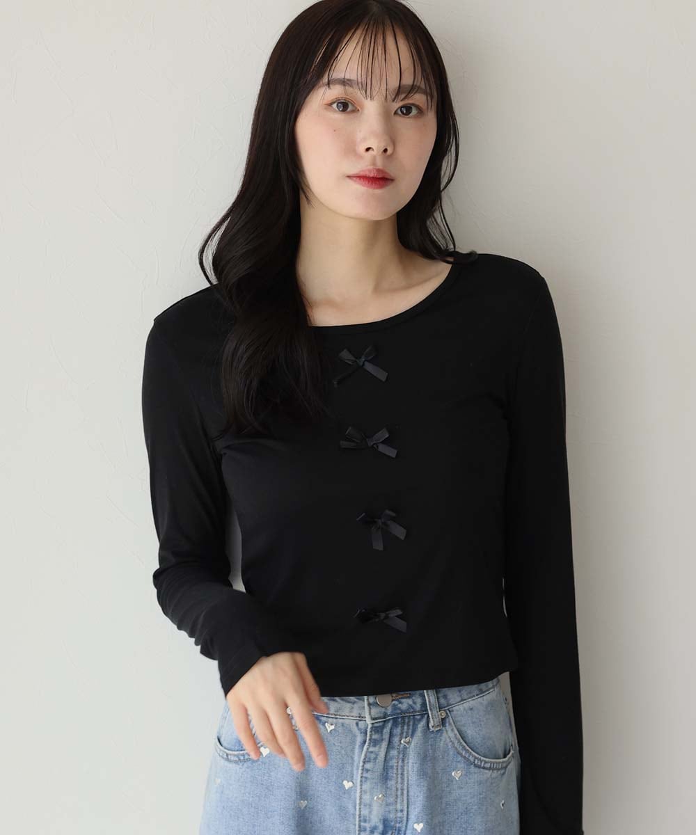 ベーシックなカットソーにラブリーなリボンをあしらったトレンド感のあるアイテム。