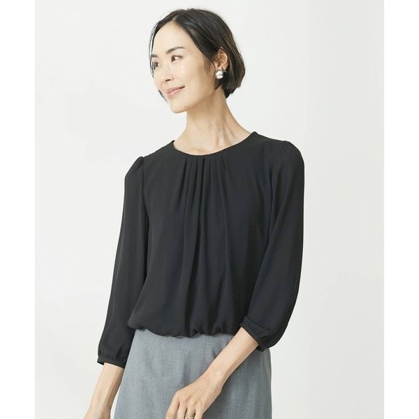 内側にコットン素材のジャージー、表にシフォンを重ねた、インナーを気にせずに一枚で着れるブラウソー。前身頃に入れたプリーツがジャケットを着ても、脱いでも華やかに見える一枚。裾にはゴムを入れ、インしなくてもインしている様に見せかけたデザインです。