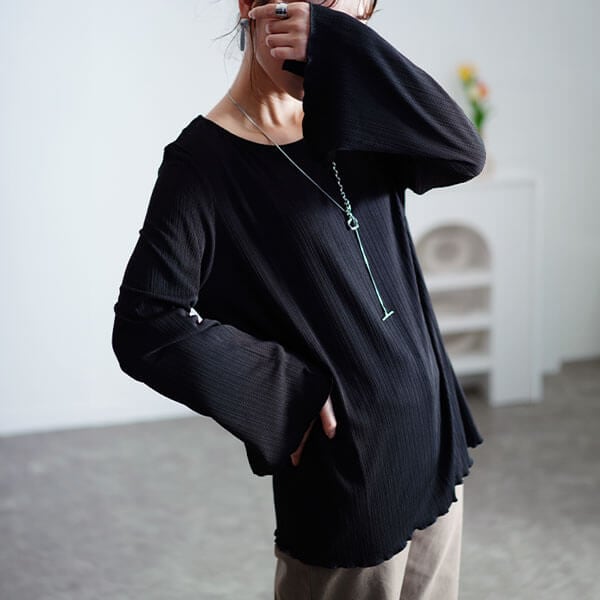 動く度に華やかなランダムテレコフレアスリーブメロウトップスの登場です☆ふわりと優雅に広がるフレアスリーブに惚れ惚れするこちらのトップスは、一枚ではもちろん、インナーとして重ね着でも楽しめるので着回し力も抜群です。裾と袖口にはメロウ始末が施してあり、さりげなく大人可愛いを演出してくれます。お尻が隠れる長めの着丈でお腹&腰回りをすっぽりカバーし、縦ラインを強調しスタイルアップ効果も期待できるのも嬉しいポイント!