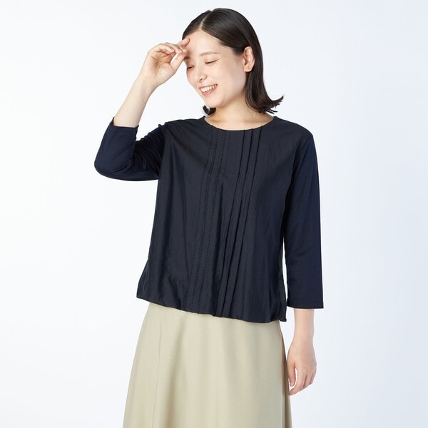 フロントの繊細なタックディテールが目を惹く、大人のシンプルフェミニンスタイルにおすすめのカットソー。スムースな肌触りの生地を採用した快適な着心地もポイントです。手首の見える袖丈とコンパクトなシルエットが軽やかなバランス感に仕上げます。