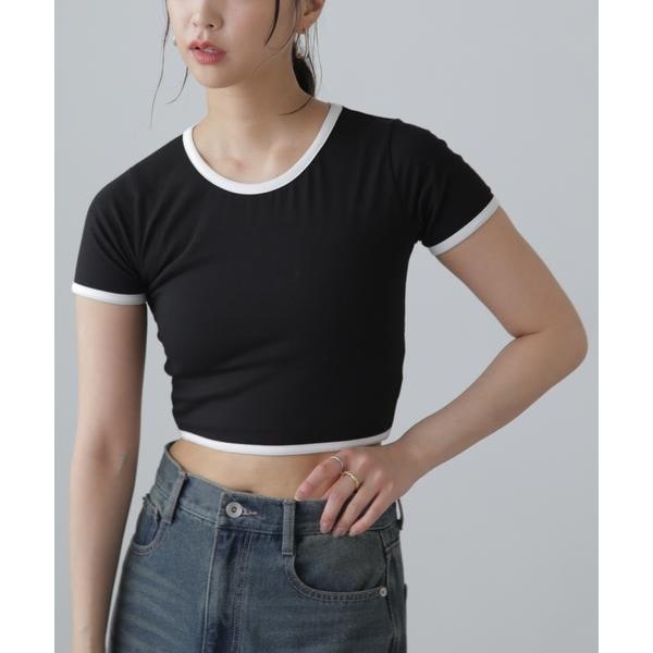 襟ぐりと袖口の配色が可愛いリンガーTシャツ。シンプルながらもワンテクのあるデザインです。形はコンパクトで体にフィットする着心地なので、ダボっとしたボトムスと合わせるのがバランス良くオススメ。インナーとしても使える万能アイテムです。※モデルの着用画像の場合、光の当たり具合により、実際の色味と異なって見えることがございます。色味は、商品単体の画像をご参照ください。