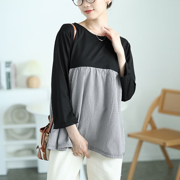 着映えてかわいい!カットソーとギンガムチェックのドッキングプルオーバーの登場です。胸下切り替えでふんわり広がるAラインシルエットが気になるお腹周りをかわいくカバーしてくれます。長すぎない丈感で合わせるボトムも選ばずコーデが楽しめます。幅広い年齢の方におすすめです。