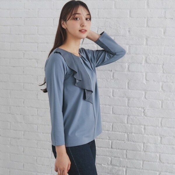 ・アシメントリーにフリルをあしらい顔周りに華やぎを与えてくれるデザイントップス