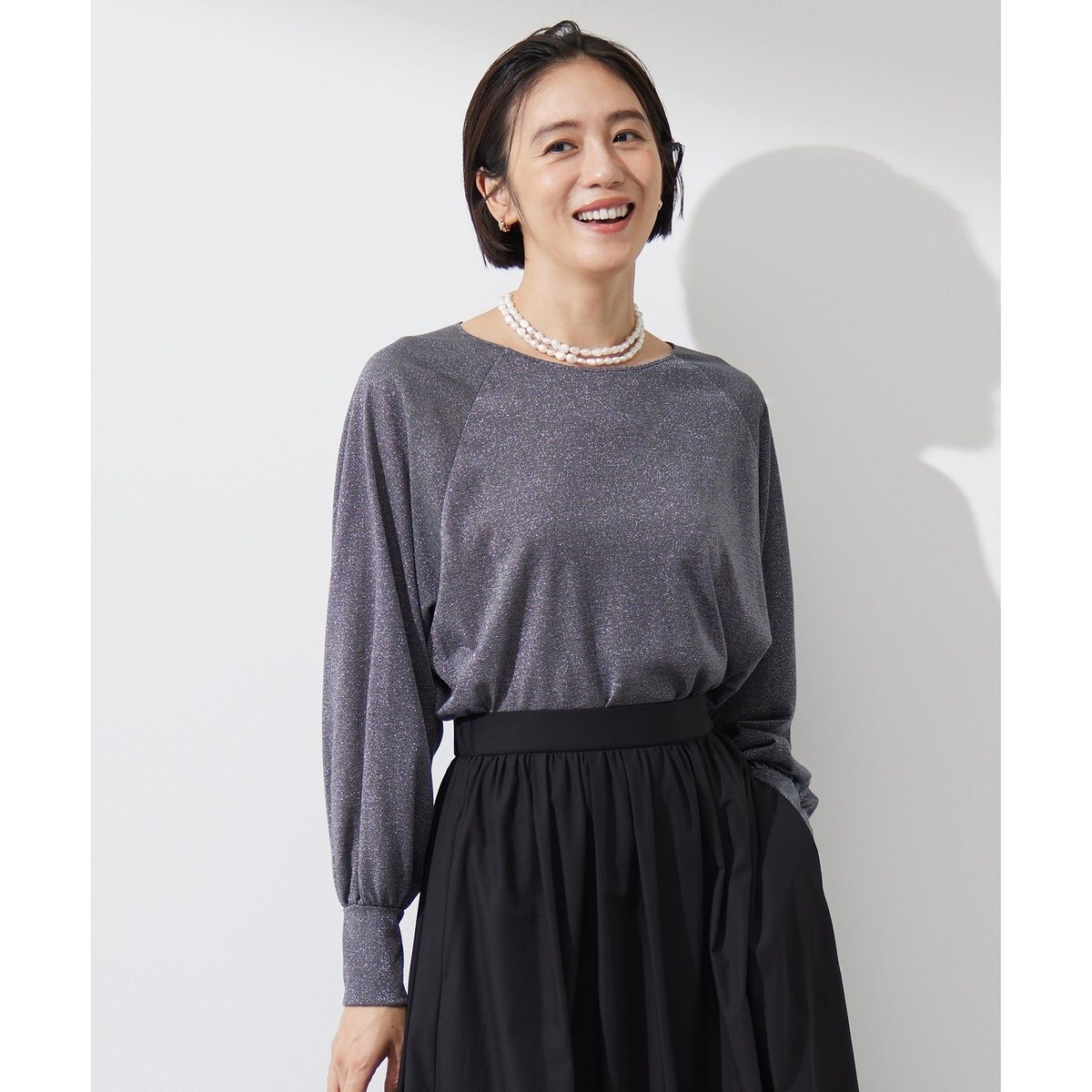 繊細で上品なラメの輝きが華やかなトレンドトップス■デザインシアー感のある素材に繊細なラメの輝きが華やかなトップスです。素材自体が華やかなので、シンプルなデザインでありながらも今年らしい印象になり、コーディネートのポイントになります。着丈に前後差があるのでボトムにインしてもアウトにしてもサマになり、パンツにもスカートにも合わせやすいデザインです。■素材肌触りが柔らかく、吸汗性、速乾性を感じるようなシアー素材です。長時間着ていてもストレスフリーな着心地が期待できます。さらに、ラメ糸を合わせることで繊細で上品な輝きを放つ、ブランドオリジナル素材です。