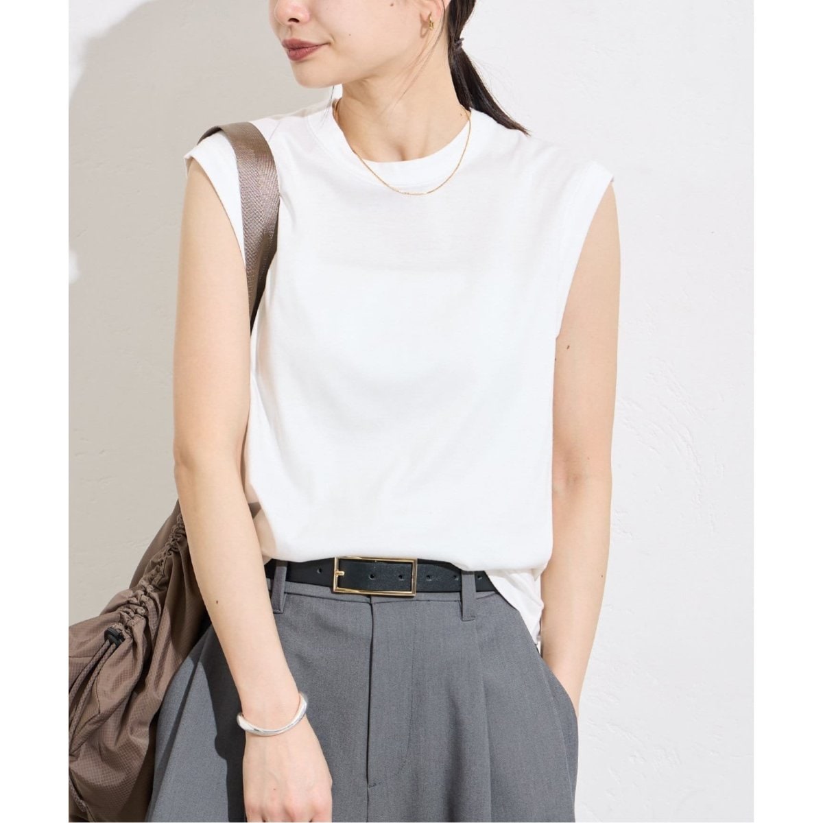 キレイ目なスムースコットン素材にナノシア汗じみ防止加工を施したノースリーブ。