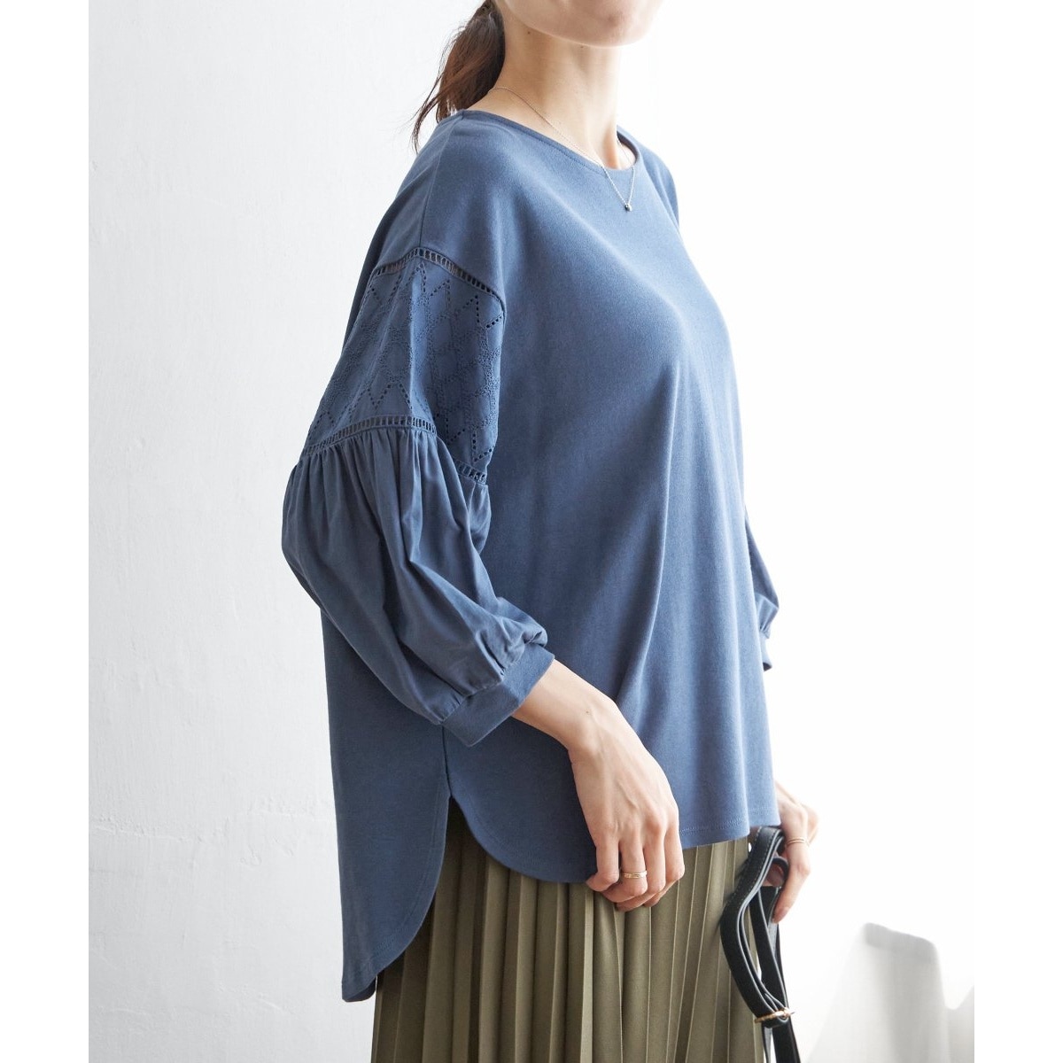 身頃はカットソー、袖は幾何学柄のレースと薄地の布帛をドッキング。