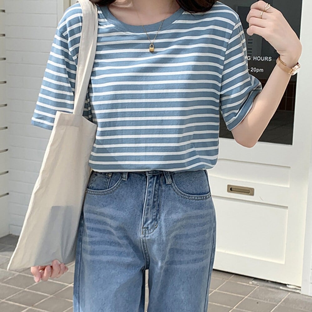 ボーダー柄がコーディネートのアクセントに映えるTシャツ