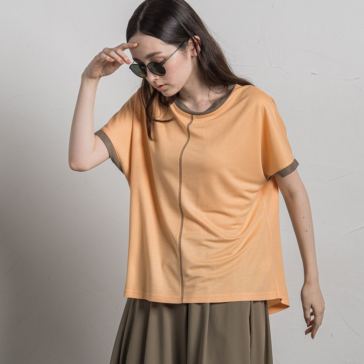 ベージュ 配色ステッチ半袖Tシャツ