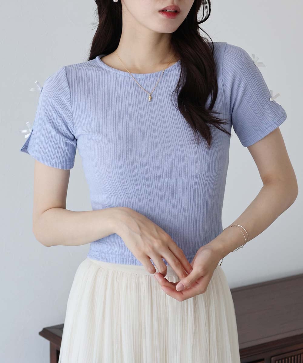 バレエコアコーデに最適なプルオーバー。袖のリボンで、女性らしい印象とトレンド感を演出します。